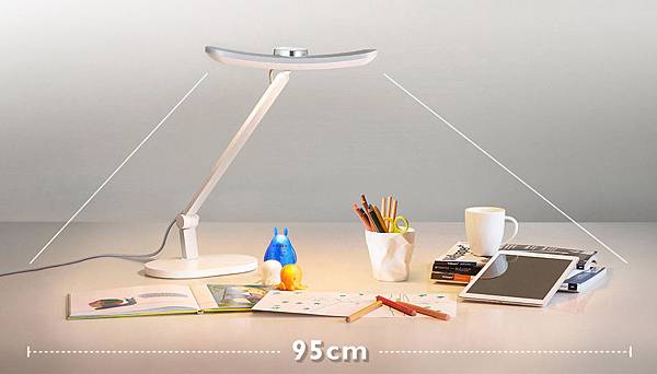 這款檯燈擁有95cm 超廣照明,是一般檯燈的150%,無論是看書、畫畫在各式的學習環境都能滿足不同的需求!還可隨心條整亮度和色溫,後面我們再繼續看下去~