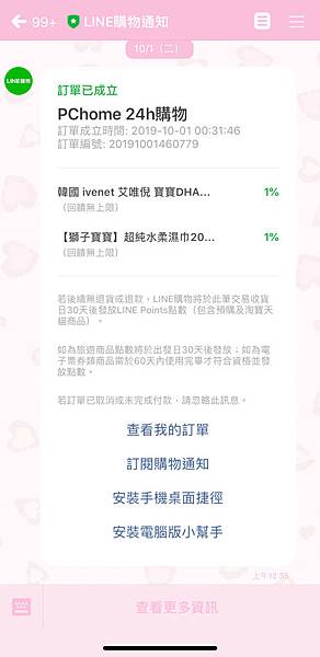 很重要的一部,就是要確定自己是不是成功用Line Points導購做購買,會收到Line購物通知的訊息,告訴你已經成功購買了,還可以追蹤訂單。