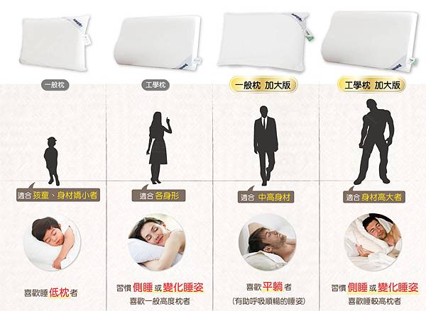 加大一般枕:中高身材、喜歡平躺者(有助呼吸順暢的睡姿)