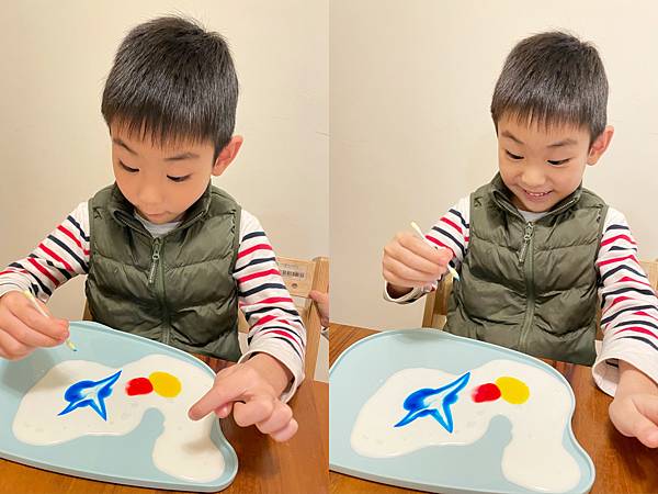 觀察親水端跟脂肪端碰到洗碗精的精彩變化,會突然炸開的情景,哥哥看了有趣又好玩