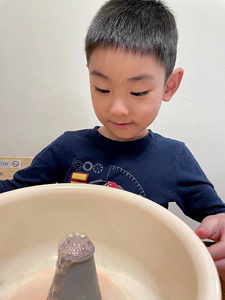 使用小蘇打和檸檬酸產生反應,這兩樣碰到水產生二氧化碳氣體,於是會有火山爆發的泡沫噴發出來!