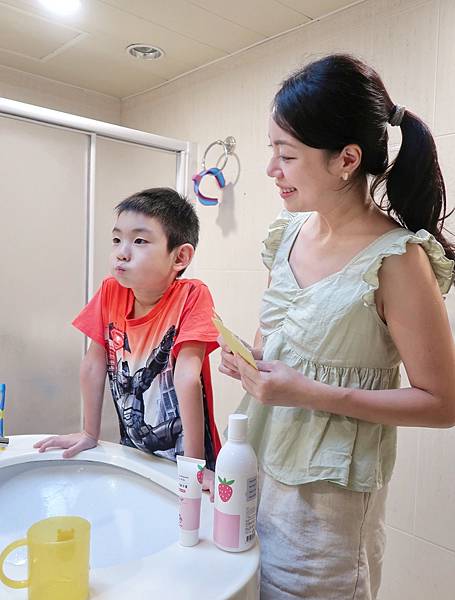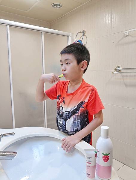 另外草莓口味的牙膏跟漱口水,孩子接手度很高,香香微甜的口感,睡前都很期待用這兩樣
