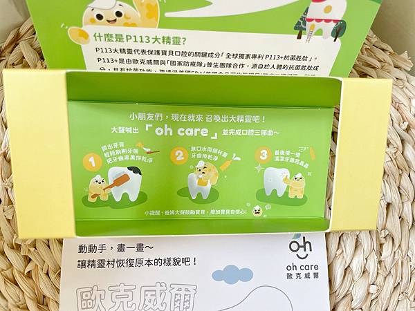 這裡有大概講解刷牙的原理給小孩看,此外歐克威爾的牙膏含氟,還1000ppm氟化物,再搭配P113⁺可以抑菌