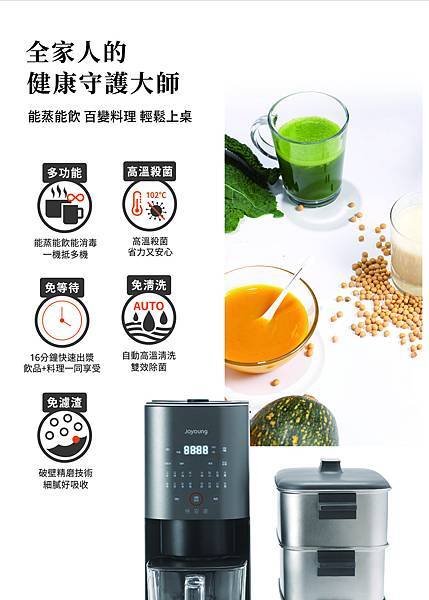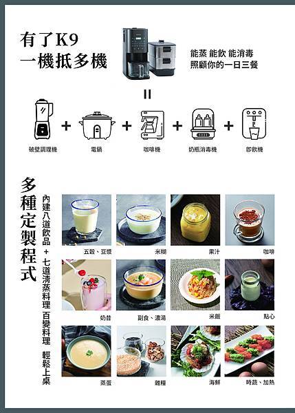 米糊(寶寶副食品)、咖啡、果汁、奶昔冰沙、濃湯、蒸點心、蒸蛋、雜糧、蒸海鮮、煮飯、時蔬加熱等等