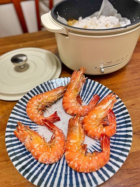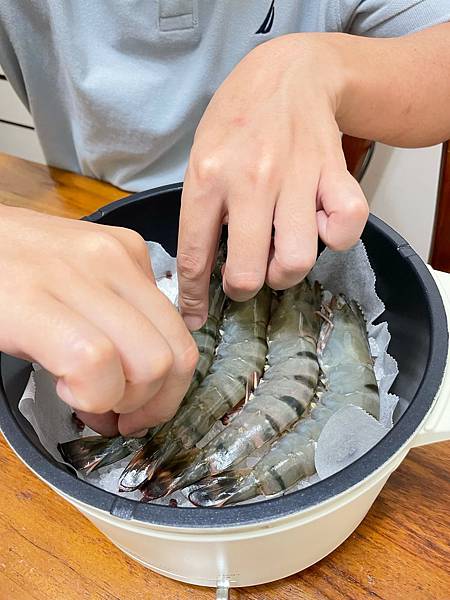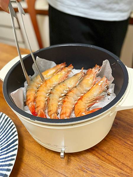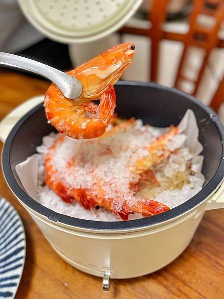鋪上草蝦以後,火力開到最大,很快大約五分鐘,香味就出來囉