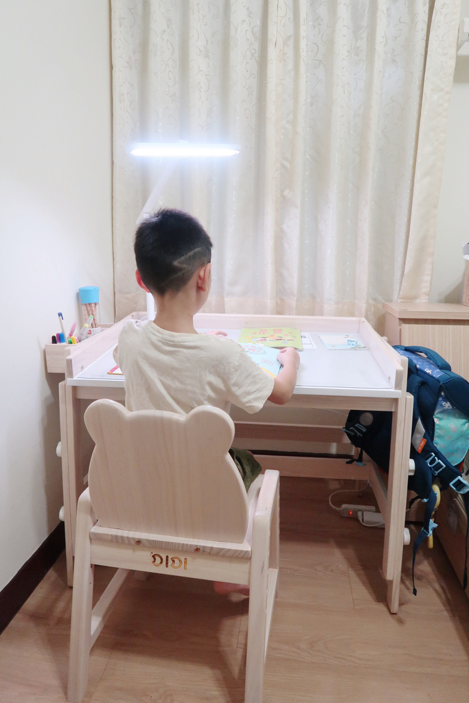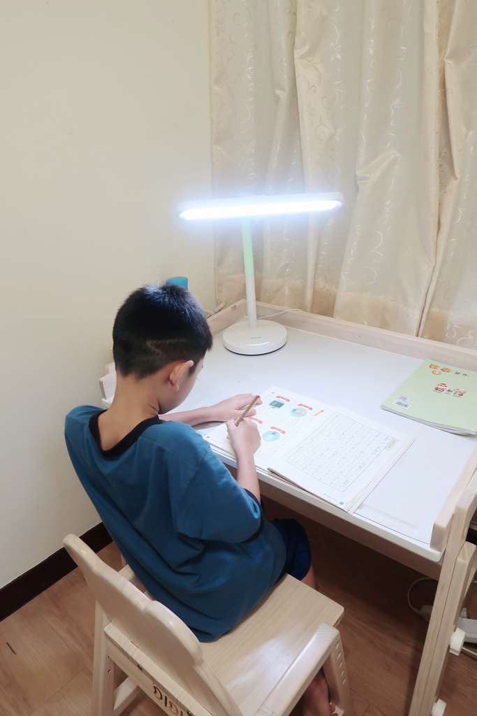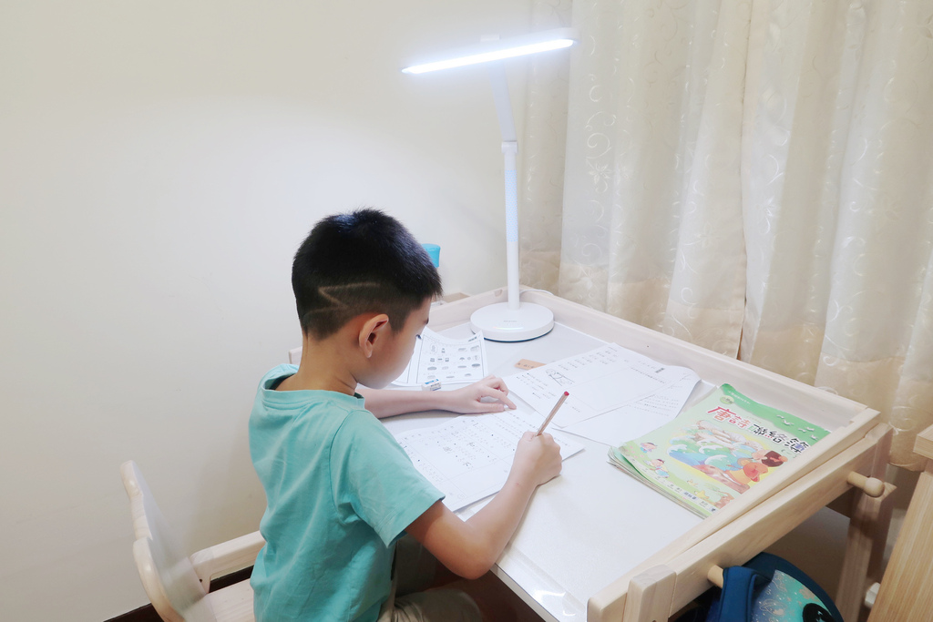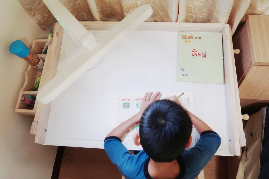 除了天氣好時每天固定戶外曬太陽運動兩小時,再來是準備好的書桌和檯燈給孩子寫功課和閱讀