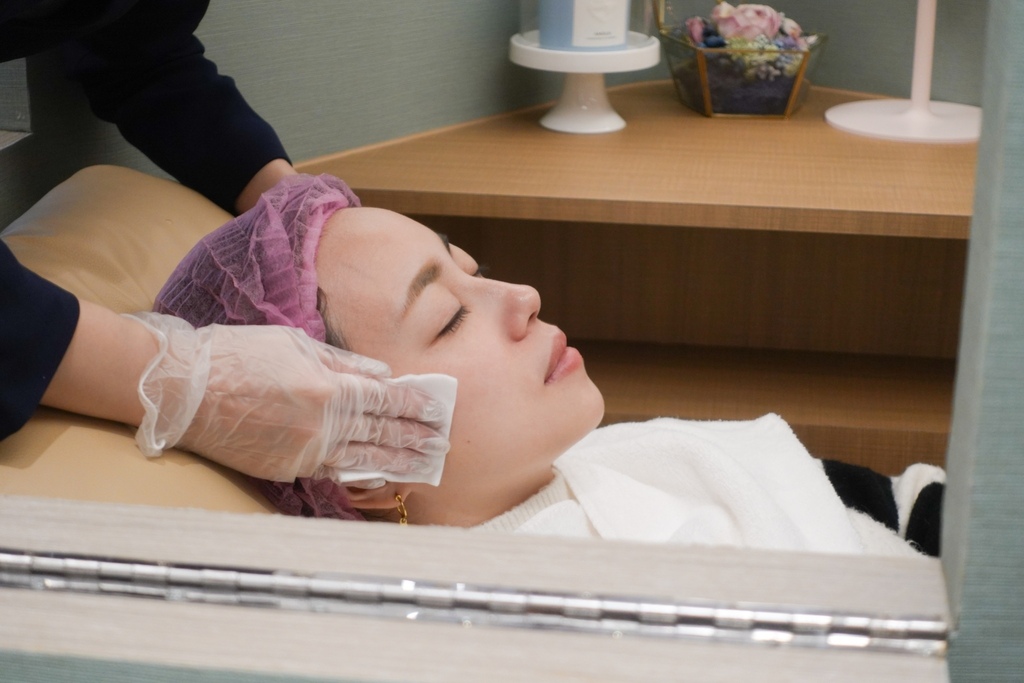 首先會溫柔的平躺在躺椅上幫忙卸妝