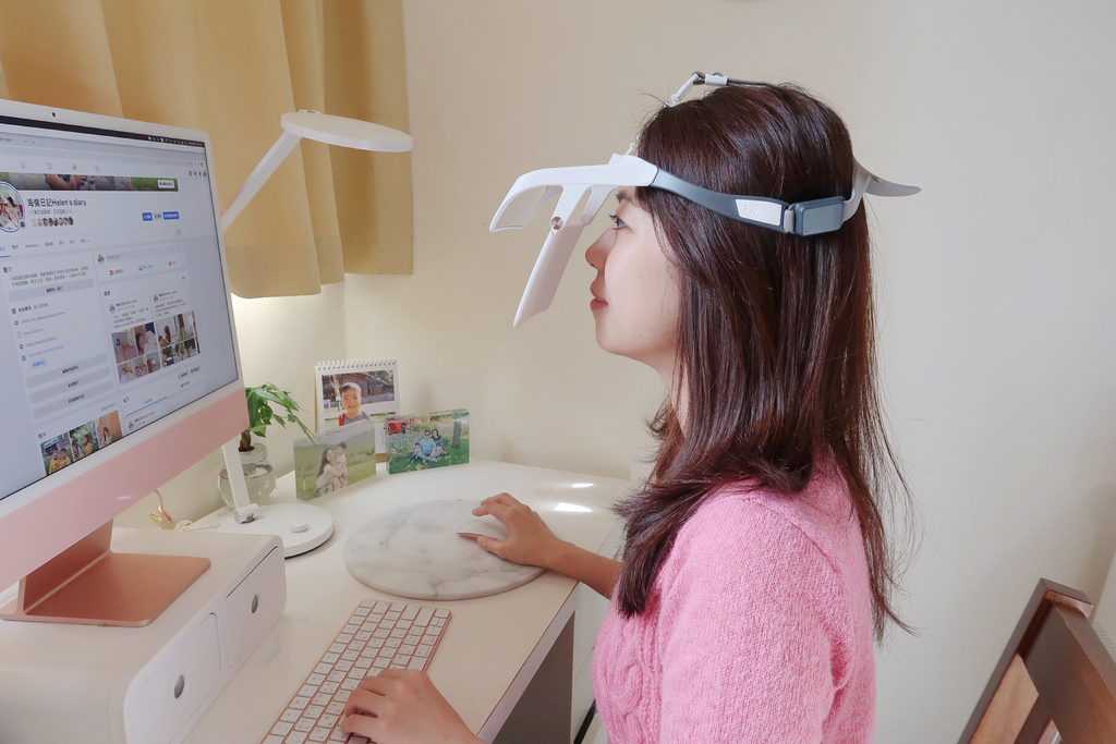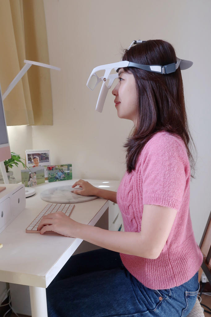 在家中走到哪戴到哪,利用兩片光學凹凸面鏡進行二次反射原理,這個遠距成像放大裝置,戴上後可將眼前的影像拉遠8公尺,放大17.7倍!