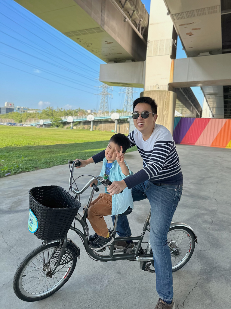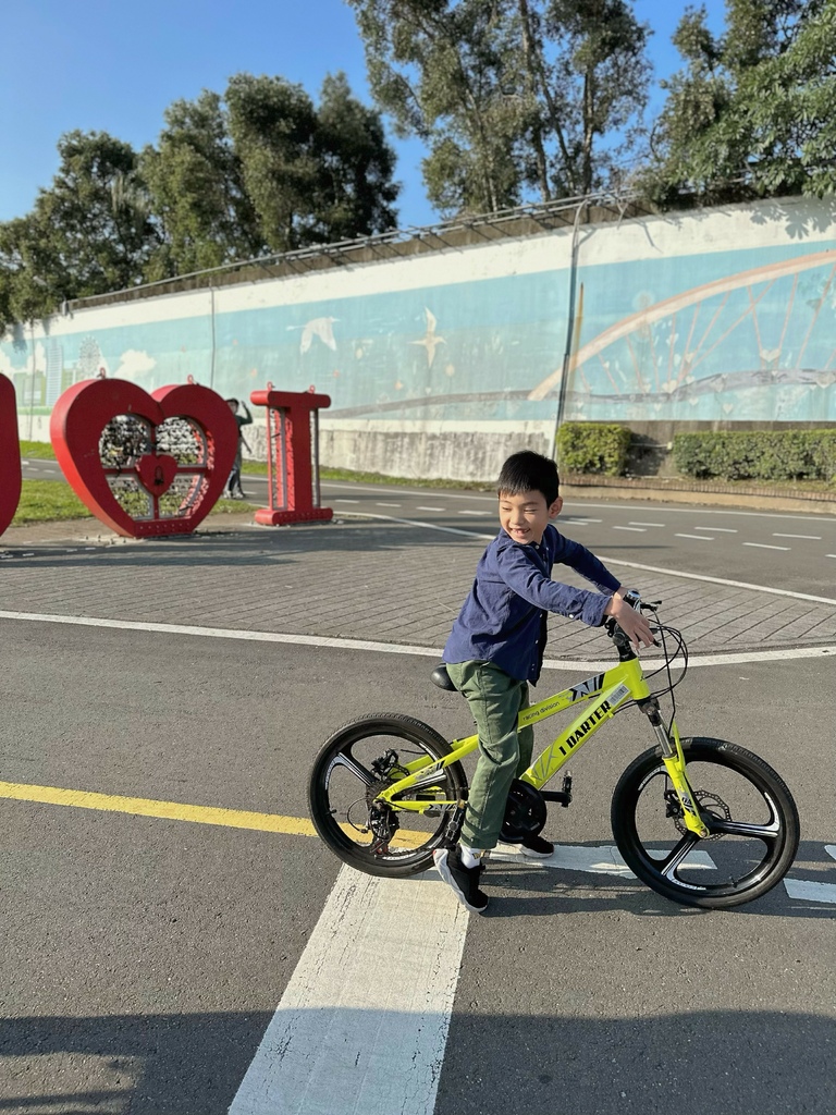 哥哥自從會騎兩輪腳踏車,就愛上腳踏車飆速的快感,來河濱公園最適合不過!