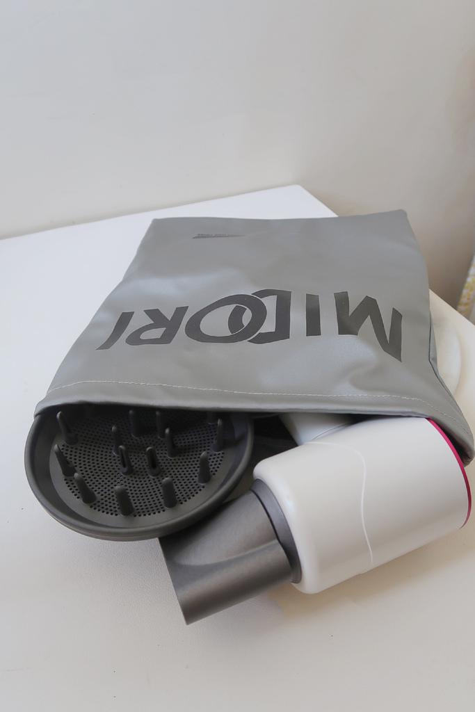 除了有吹風機本體,還有完整配件,包括順髮吹頭、抗毛躁吹頭、溫和吹頭、集風吹頭、捲髮烘罩、收納架、收納袋