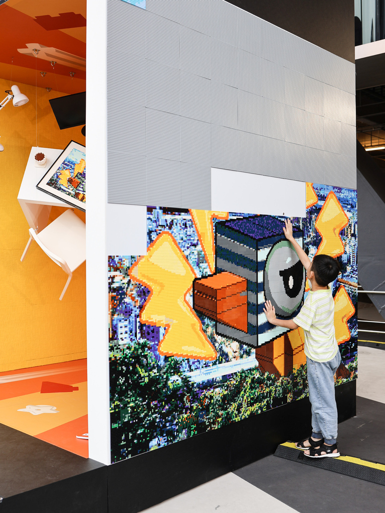 用樂高拼湊壁畫上的顏色,建議大人陪伴一起完成