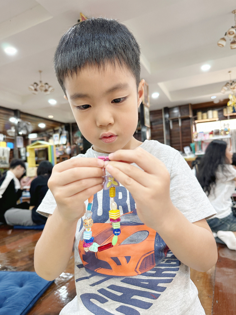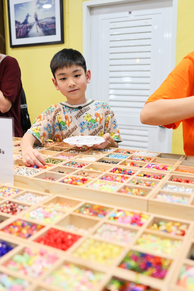 小孩來這也不無聊,可以手作飾品、畫畫塗鴉、作鑰匙圈,河邊餵食大群的魚!
