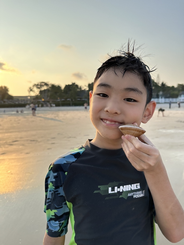 哥哥還撿到一顆大蛤蠣!活的喔!!