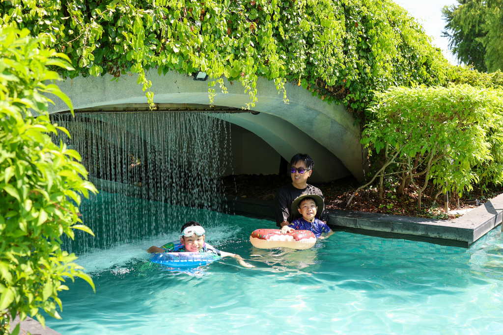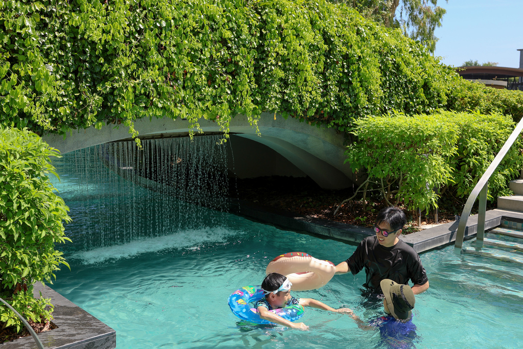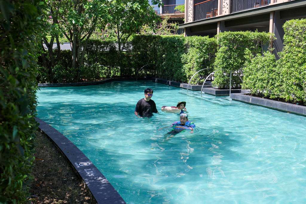 多達五大游泳池,和環繞園區的漂漂河,還有專屬成人泳池區