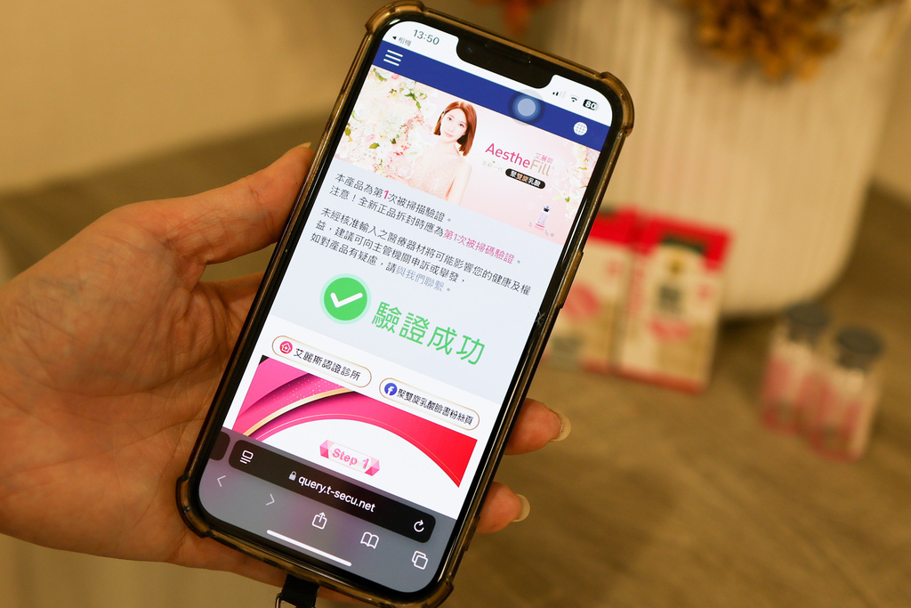 在專業上也沒路說,施打前會把原廠正品拿出來給客人知道,手機一掃就可以辨別真偽