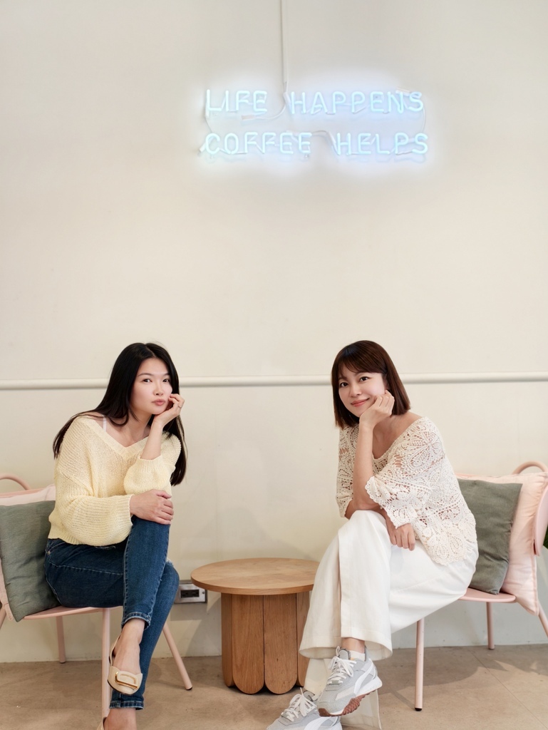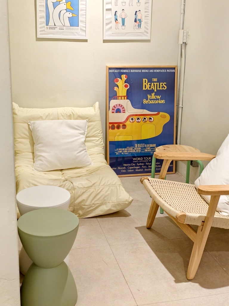 走進店裡,氛圍超舒服!奶油白+木質調為主視覺,有些插畫與復古海報妝點