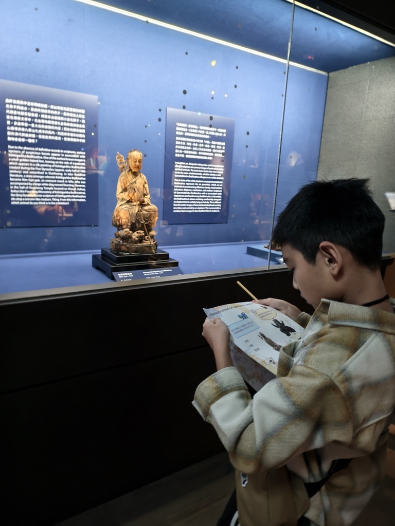 我們家孩子就戴著耳機聽導覽,拿著任務單仔細觀察佛像旁的小動物