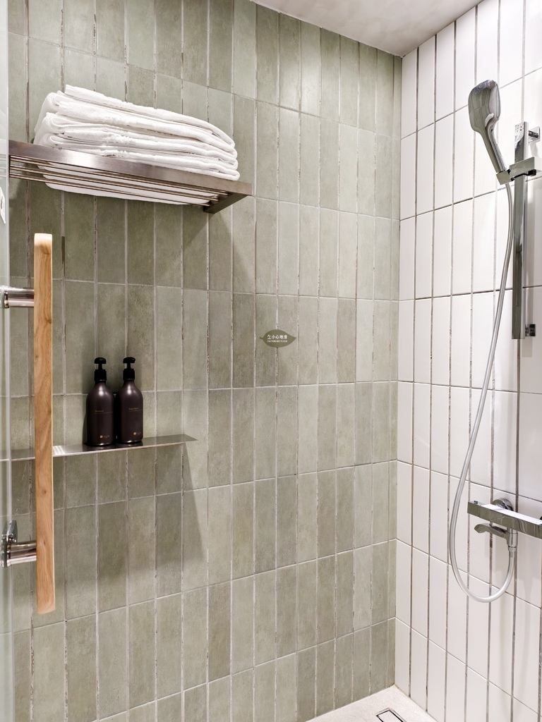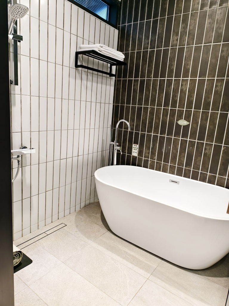 一旁的木屋雙人房,浴室是開放式設計,但有巧妙區隔,洗手台+乾濕分離空間剛剛好,還有浴缸喔!