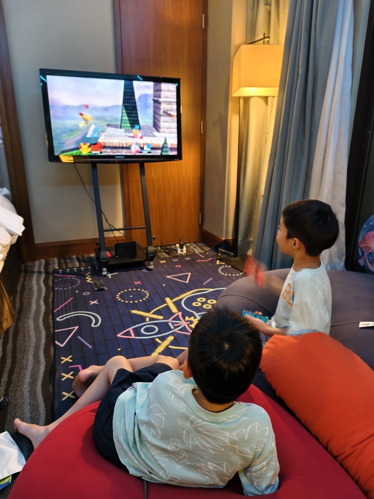 最受小孩喜愛的就是房內直接配有Switch電玩,大螢幕搭配懶骨頭沙發,兄弟倆玩起賽車遊戲嗨到不行