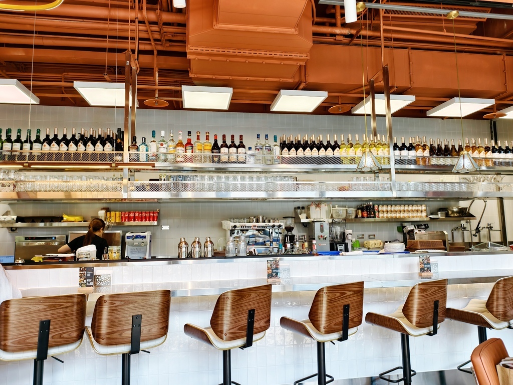 酒吧吧檯區:整排高腳椅搭配酒櫃,滿滿的酒瓶陳列在眼前,無論白天喝咖啡、晚上小酌都非常有情調
